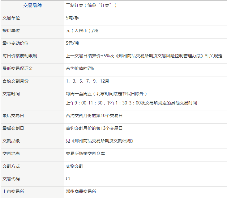 红枣期货一手保证金约为7404元,交易所保证金比例为12%,交易单位一手5吨,最小变动价格5元/吨,每波动一个最小单位,盈亏25元。目前在郑州商品交易所交易品种,代码为CJ