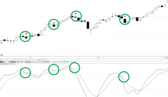 如果行情看型态很明显趋势是往上的,那就尽量找KD黄金交叉去做买进。以红圈的位置来说,买进以后确实还都有再涨一段。趋势往上走,找到黄金交叉的买点是好的、值得参考的。