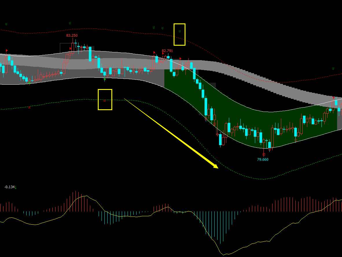 1: 请问公式中K线附近的两条白线就是你说的那个20高低点日加权吗?可以写一个类似于这两条线的指标吗,可以用已经收盘的20根K线做加权。