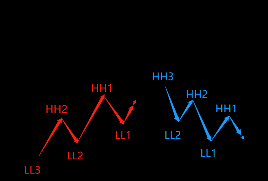 如蓝色图:当波段高点HH1成立时,求出本波反弹的幅度值Y1(自HH2下跌到LL1后反弹到HH1的百份比值)。