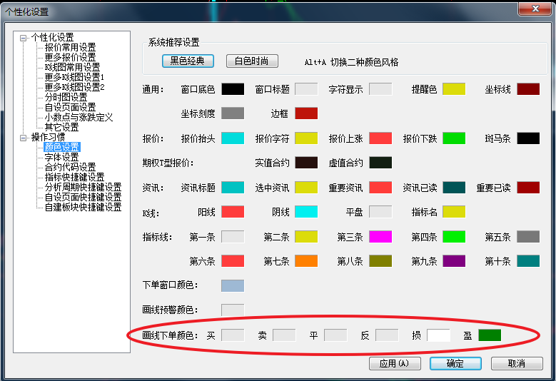请问如何修改止损单标识的颜色或者隐藏止损单条件单 (文华财经WH6赢顺V6.7)投资者咨询:请问如何修改止损单标识的颜色或者隐藏止损单条件单 (文华财经WH6赢顺V6.7)来源:文华财经 日期:2018-8-29 10:49 请问如何修改止损单或者条件单虚线标识的颜色或者隐藏止损单条件单?技术人员回复日期:2018-8-29 10:56软件右上角个性化-个性化设置-颜色设置,这里可以修改损盈单条件单颜色 分时图/k线图右键更多-临时隐藏画线下单,快捷键Ctrl+O,您试下