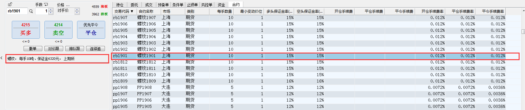 你看右侧红框处合约项下显示了保证金率及手续费率,这两项应该是从期货公司调取的,我意思是能不能在左侧红框处像显示每手保证金数样显示每手开平仓的手续费数,比如螺纹每手几元,保证金率多少,这样显示,行吗?