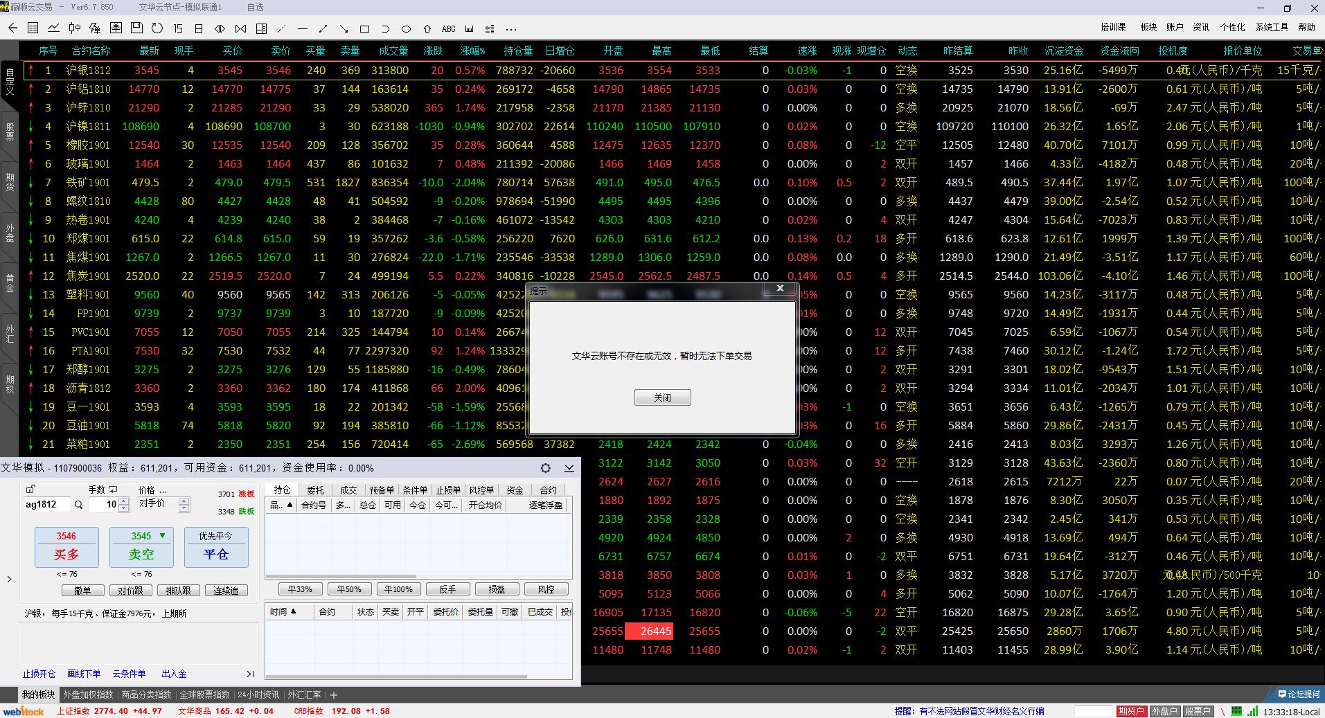 [求助]模拟账号无效,不能下单? (文华财经WH6赢顺V6.7)投资者咨询:[求助]模拟账号无效,不能下单? (文华财经WH6赢顺V6.7)来源:文华财经 日期:2018-8-27 13:48 咋回事尼?技术人员回复日期:2018-8-27 13:49 用你的模拟交易帐号,登录文华云,获得文华豆,就可以进行模拟交易右上角菜单》系统工具》文华云服务参考文华官网的介绍了解一下:https://www.wenhua.com.cn/fzjy/index.asp