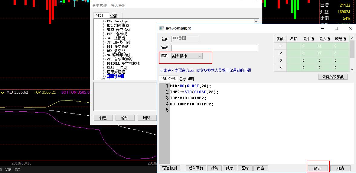 怎样把boll加到副图指标 (文华财经WH6赢顺V6.7)投资者咨询:怎样把boll加到副图指标 (文华财经WH6赢顺V6.7)来源:文华财经 日期:2018-8-27 11:42 老师 怎么把boll加到副图指标技术人员回复日期:2018-8-27 13:08 右上角》系统工具》指标管理器》新建》复制一下源码后选择“副图指标”点击确定加载就可以 MID:MA(CLOSE,26);TMP2:=STD(CLOSE,26);TOP:MID+3*TMP2;BOTTOM:MID-3*TMP2;