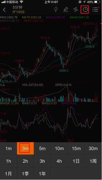 老师好,帮我解决下 (文华财经随身行iPhone 5.4.5)投资者咨询:老师好,帮我解决下 (文华财经随身行iPhone 5.4.5)来源:文华财经 日期:2018-8-27 10:41 我切按周期K线时,切换三分钟怎么变三小时,5分钟显示5小时了,怎么回事技术人员回复日期:2018-8-27 11:11您是在K线图右上方点周期按钮,选择的周期进行切换? 正常不会有问题的,请具体说明下您的操作步骤,并提供截图,我们对应分析下