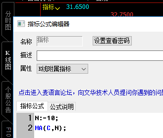请教老师一个问题 (文华财经WH6赢顺V6.7)投资者咨询:请教老师一个问题 (文华财经WH6赢顺V6.7)来源:文华财经 日期:2018-5-18 11:13 怎样能不显示蓝框里的数字,不显示参数值?技术人员回复日期:2018-5-18 11:23 参考下图,将参数在源码中定义左上角就不会显示了 N:=10;MA(C,N);
