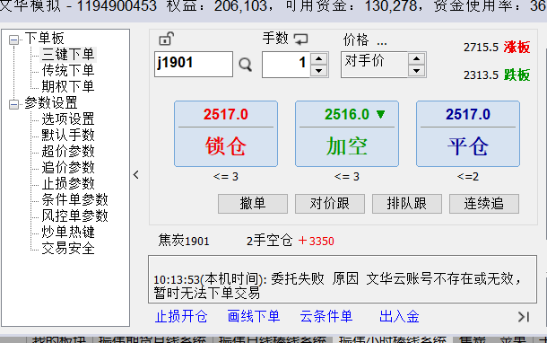 模拟不能交易 (文华财经WH6赢顺V6.7)投资者咨询:模拟不能交易 (文华财经WH6赢顺V6.7)来源:文华财经 日期:2018-8-27 10:16为什么我的文华模拟账户,今天不能交易? 文件名:screenshot20180827101533.png 技术人员回复日期:2018-8-27 10:20 软件右上角帮助-升级,升级到最新版本,然后模拟交易帐号登录文华云 右上角菜单》系统工具》文华云服务,登录文华云账号,激活钱包 获得文华豆,就可以进行模拟交易请参考文华官网的介绍了解一下:https://www.wenhua.com.cn/fzjy/index.asp