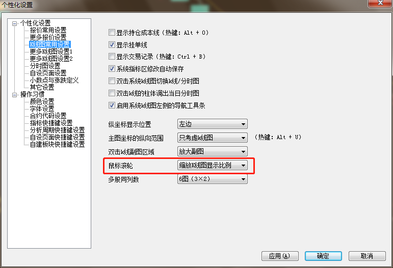 PS:个性化》个性化设置,截图所示设置鼠标滚轮切换k线密度