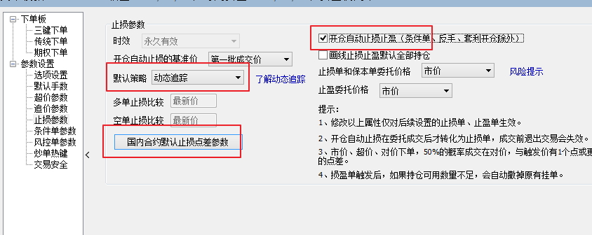 动态止损问题 (文华财经WH6赢顺V6.7)投资者咨询:动态止损问题 (文华财经WH6赢顺V6.7)来源:文华财经 日期:2018-5-17 11:41 说明书中介绍的保本止损没有看明白,是怎么设置的?是不是有盈利时才能设置呀?并不是一开仓就设置的?技术人员回复日期:2018-5-17 13:09什么时间设置都可以,和是否处于盈利状态没有关系方法1. 动态追踪可以开仓之后手动设置,在持仓栏右键》设置云止损单方法2. 也可以开启开仓自动止盈止损的选项,开仓之后会自动生成止损单 勾选开仓自动止盈止损的选项,默认策略选择动态追踪,提前设置好价差