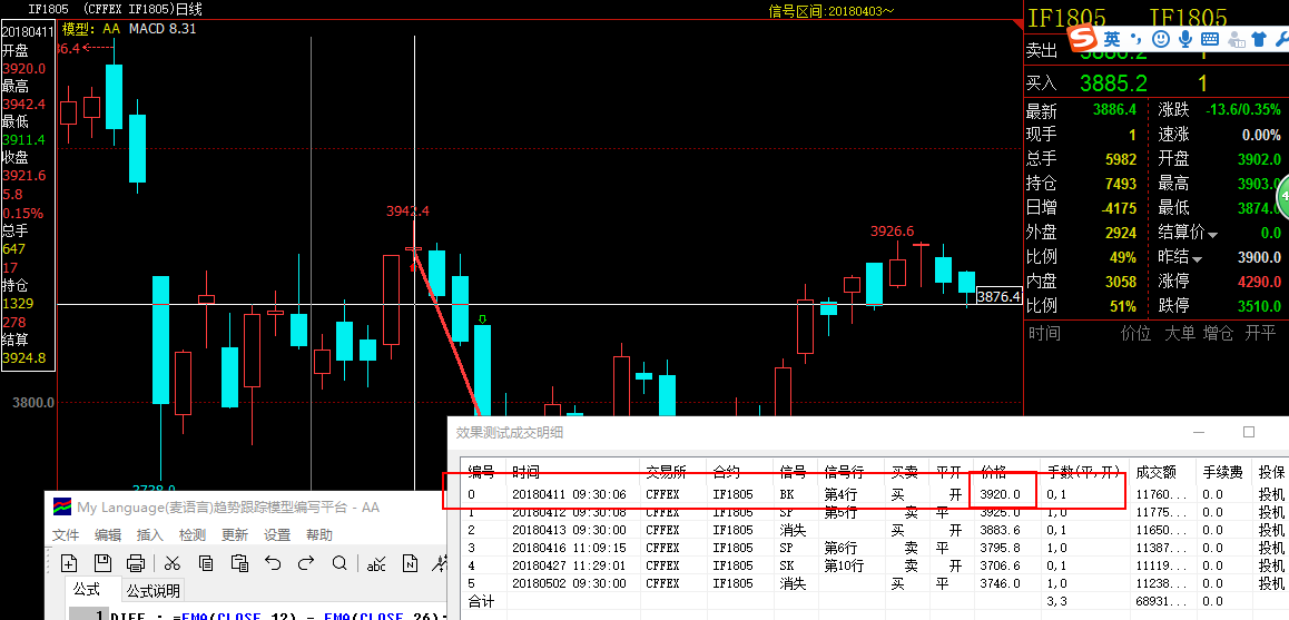 DIFF : =EMA(CLOSE,12) - EMA(CLOSE,26); DEA : =EMA(DIFF,9); MACD:2*(DIFF-DEA); CROSS(DIFF, DEA) AND BKVOL=0 AND ABS(DIFF-DEA)>=1.8 AND 0905<TIME,BK; BKVOL>0 AND C>BKPRICE+10*MINPRICE,SP; CROSS(DEA,DIFF),SP; CROSS(DEA,DIFF) AND SKVOL=0 AND ABS(DIFF-DEA)>=1.8 AND 0905<TIME,SK; SKVOL>0 AND C<SKPRICE-10*MINPRICE,BP; CHECKSIG(SK,'A',0,'D',0,0);//出信号立即下单,K线走完复核 CHECKSIG(BK,'A',0,'D',0,0);//出信号立即下单,K线走完复核 CHECKSIG(SP,'A',0,'D',0,0);//出信号立即下单,K线走完复核 CHECKSIG(BP,'A',0,'D',0,0 ); |
