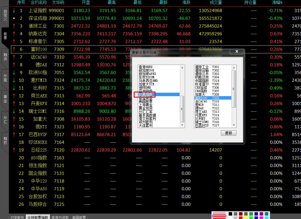 系统不断更新,不见了富时指数 (文华财经WH6赢顺V6.7)投资者咨询:系统不断更新,不见了富时指数 (文华财经WH6赢顺V6.7)来源:文华财经 日期:2018-5-16 23:25 在全球股票指数 找不到 英国 富时指数 。不知什么时候,更新以后・,就不见了技术人员回复日期:2018-5-17 8:14 正常是可以查看的 在软件右上角》更新交易所码表,选择欧美指数更新看下 同时也在报价右键》隐藏合约中看下是否之前误操作隐藏了,取消隐藏即可
