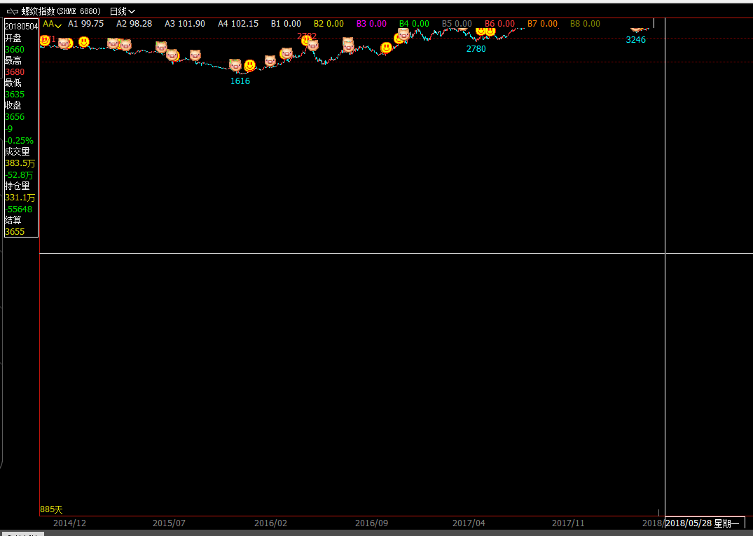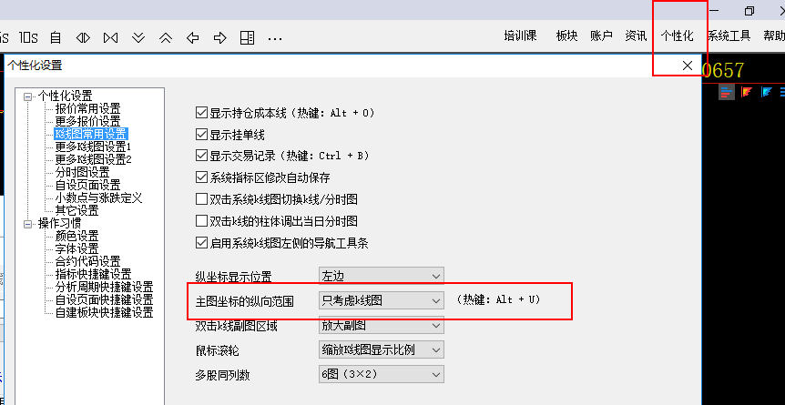 请教一个问题 (文华财经WH6赢顺V6.7)投资者咨询:请教一个问题 (文华财经WH6赢顺V6.7)来源:文华财经 日期:2018-5-15 16:49 请问老师,我写了两句画图标的语句DRAWICON(B8,H,'ICO78'),DRAWICON(B4,L,'IC01'),K线图上怎么变成这样了技术人员回复日期:2018-5-15 16:57 这里是因为中间变量B1 B2等返回值过小,导致K线图被压缩了 给您提供两种解决办法: 在源码中使用“:=”定义对应的变量,来避免压缩 或者参考下图,在个性化设置中,设置纵坐标范围仅考虑K线图