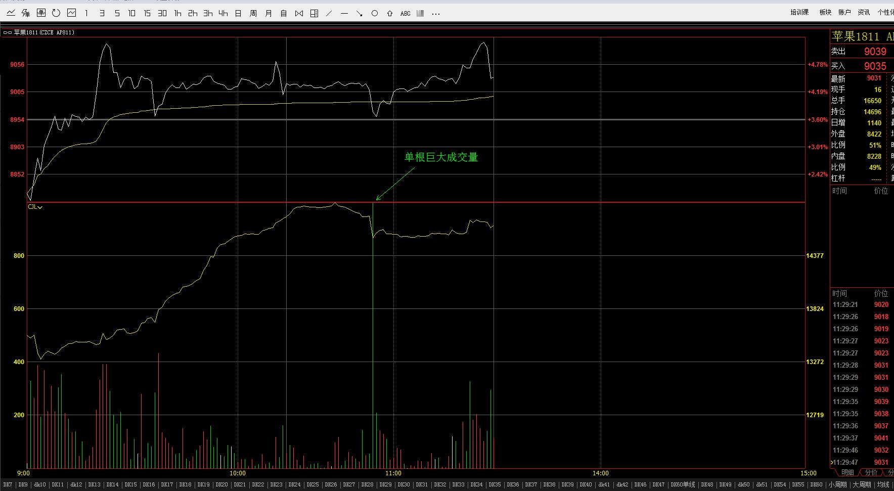 对苹果期货来讲 三万的成交量是巨量 但对于锌白糖邓品种来讲三万的成交量太大了 不会预警的呀 我的意思在所有品种上只要放一根明显的巨量就预警