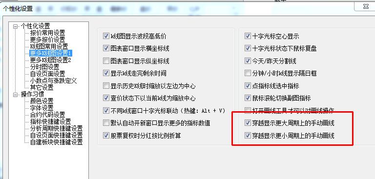 如何实现画线在不同周期K线图上显示 (文华财经WH6赢顺V6.7)投资者咨询:如何实现画线在不同周期K线图上显示 (文华财经WH6赢顺V6.7)来源:文华财经 日期:2018-5-15 15:49 大神! 如何实现画线在不同周期K线图上显示?谢谢技术人员回复日期:2018-5-15 15:51 软件右上角》个性化》个性化设置,参考截图位置进行设置 另外,看您刚接触软件,在右上角》帮助》软件说明书中多了解下软件功能,对您日后使用也会很有帮助的