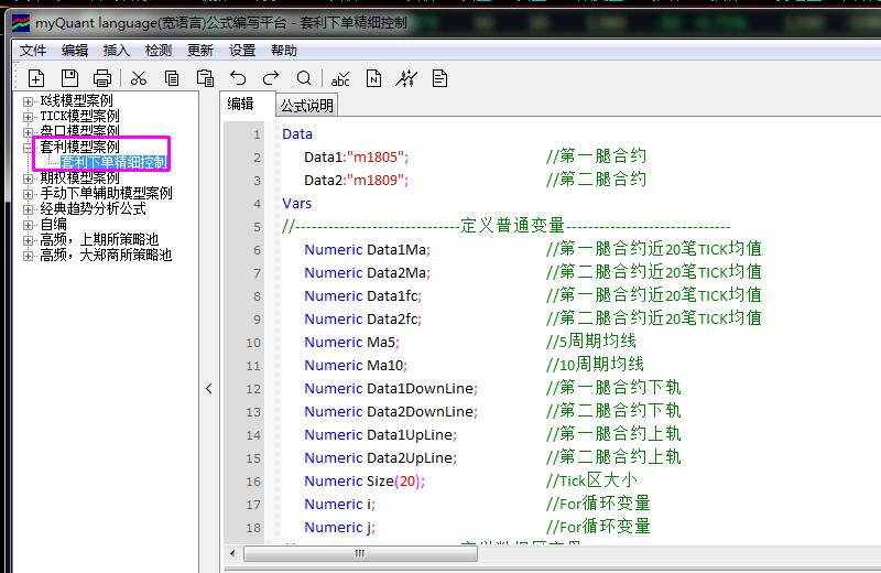 如何编写同时买多卖空两个期货合约下单模型 (文华财经wh9)投资者咨询:如何编写同时买多卖空两个期货合约下单模型 (文华财经wh9)来源:文华财经 日期:2018-5-15 12:47 比如说m1805,m1819技术人员回复日期:2018-5-15 15:18 您这个是跨期套利的思路,需要通过MQ专门的套利盒子页面来实现 1.右上角》个性化》自设套利合约创建价差K线图,在此基础上来进行套利策略的开发和研究 2.如下图,可以找到系统自带的套利程序化案例,您可以先学习一下,待思路成熟,有具体思路了,可以再进一步沟通 软件右上角》帮助》软件说明书中也对套利程序化做了更为详细的介绍