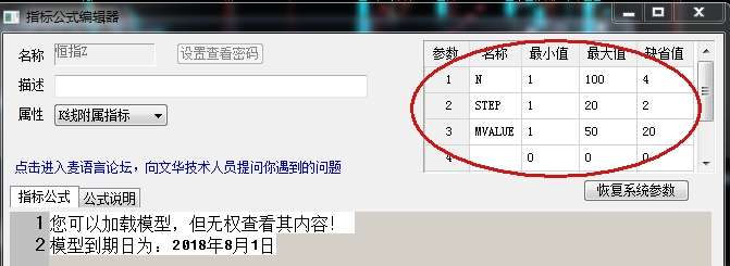 请问老师 红圈部分参数可以隐藏掉吗 (文华财经WH6赢顺V6.7)投资者咨询:请问老师 红圈部分参数可以隐藏掉吗 (文华财经WH6赢顺V6.7)来源:文华财经 日期:2018-5-15 10:25 请问老师 红圈部分参数可以隐藏掉吗技术人员回复日期:2018-5-15 10:35可以将参数写入源码中去定义 N:=4;STEP:=2;MVALUE:=20;