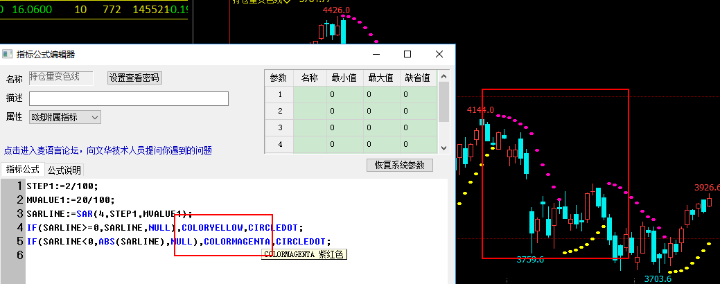 SARLINE:=SAR(4,STEP1,MVALUE1);