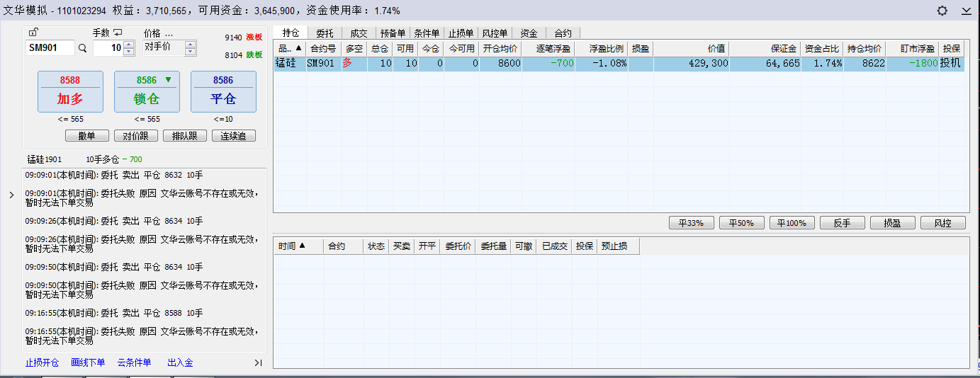 截图反映软件问题 (文华财经WH6赢顺V6.7)投资者咨询:截图反映软件问题 (文华财经WH6赢顺V6.7)来源:文华财经 日期:2018-8-27 9:18显示账号不存在不能操作 文件名:screenshot20180827091736.png技术人员回复日期:2018-8-27 9:22 用你的模拟交易帐号,就可以登录文华云右上角菜单》系统工具》文华云服务,登录文华云账号,获得文华豆,就可以进行模拟交易参考文华官网的介绍了解一下:https://www.wenhua.com.cn/fzjy/index.asp