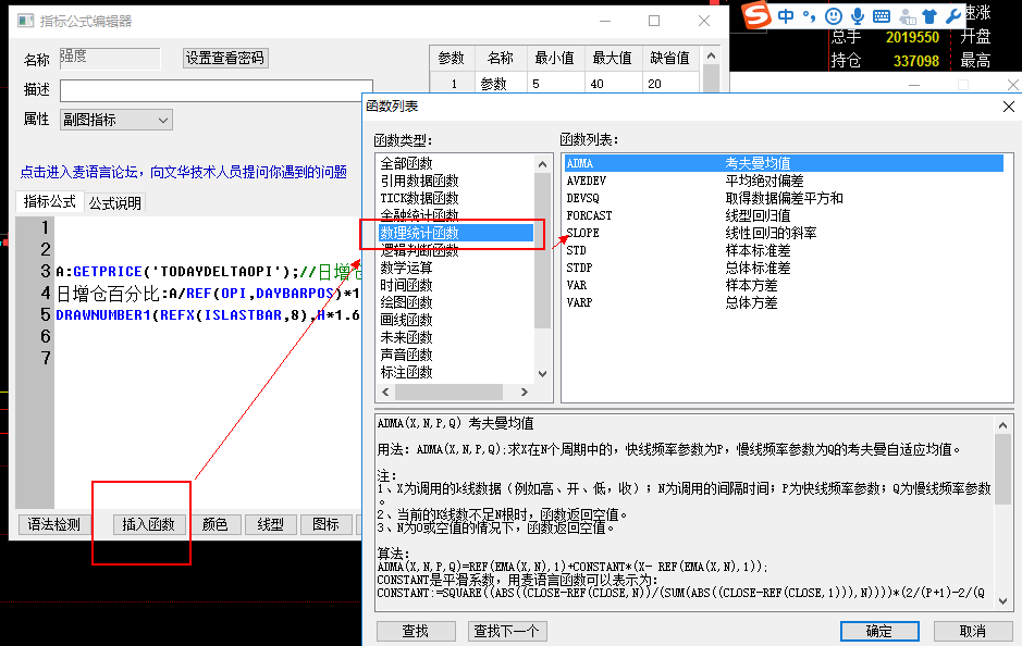 请教一个问题 (文华财经WH6赢顺V6.7)投资者咨询:请教一个问题 (文华财经WH6赢顺V6.7)来源:文华财经 日期:2018-5-14 16:08 老师你好,请问文华上有没有计算在一段时期内价格的标准差的函数吗? 谢谢!技术人员回复日期:2018-5-14 16:13 有的,使用STD(X,N)可以求X在N个周期内的样本标准差 并且,此类函数您都可以参考下图在函数列表中查找投资者咨询:请教一个问题 (文华财经WH6赢顺V6.7)来源:文华财经 日期:2018-5-14 16:08 谢谢!那请问老师,有对某一个变量求一阶导数的函数吗 技术人员回复日期:2018-5-14 18:07 目前暂时没有求导数的函数 如果您是需要求涨速,可以参考一下SLOPE求N周期的线性回归斜率来衡量,您了解一下