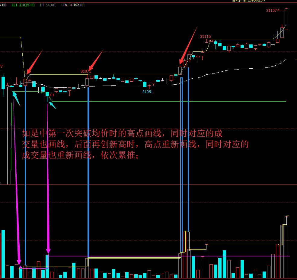 征对日内的,求开盘以来价格第一次上穿日内分时均价以后的最高点的价格和这个价格K线的成交量,用在1分钟K线上的,求开盘以来价格第一次下穿日内分时均价以后的最低点和成交量;这个怎么写?谢谢老师