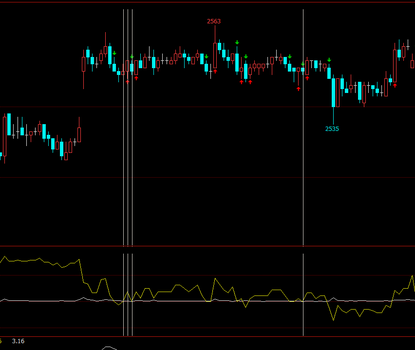 T2:(C-REF(O,N-1))/(HHV(H,N)-LLV(L,N));//黄线