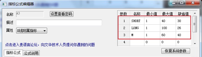 A:=(3*C+L+O+H)/6;//3倍收盘价与最高价、最低价、开盘价之和的均值。