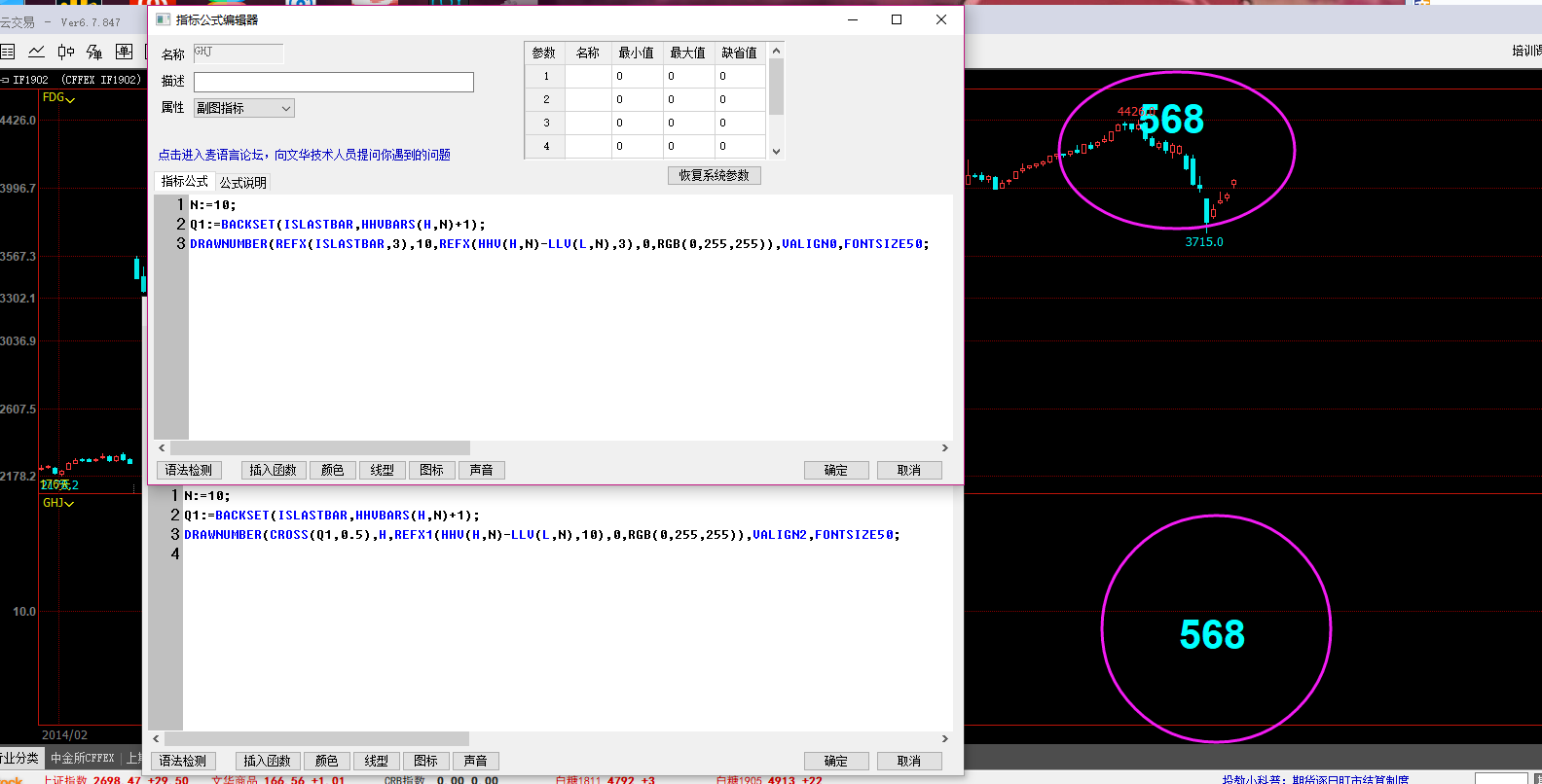 DRAWNUMBER(CROSS(Q1,0.5),H,REFX1(HHV(H,N)-LLV(L,N),10),0,RGB(0,255,255)),VALIGN2,FONTSIZE50;