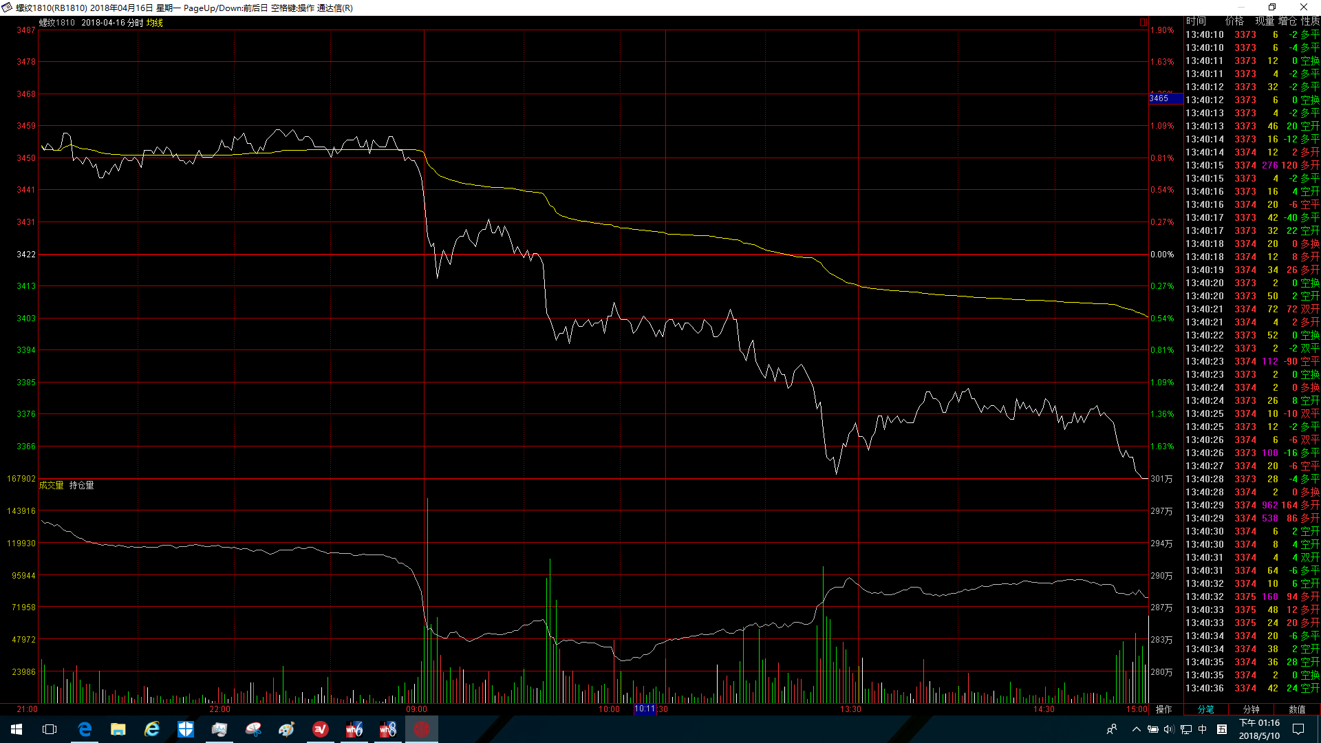 逐笔明细的时候都要去通达信查询,图片是通达信4月16号RB1810下午13:40的逐笔明细,这个对复盘很有好外,文化是不是应该也把这个功能加进去 ? 是的,文华保存当前交易日的逐笔明细,历史的看不到了