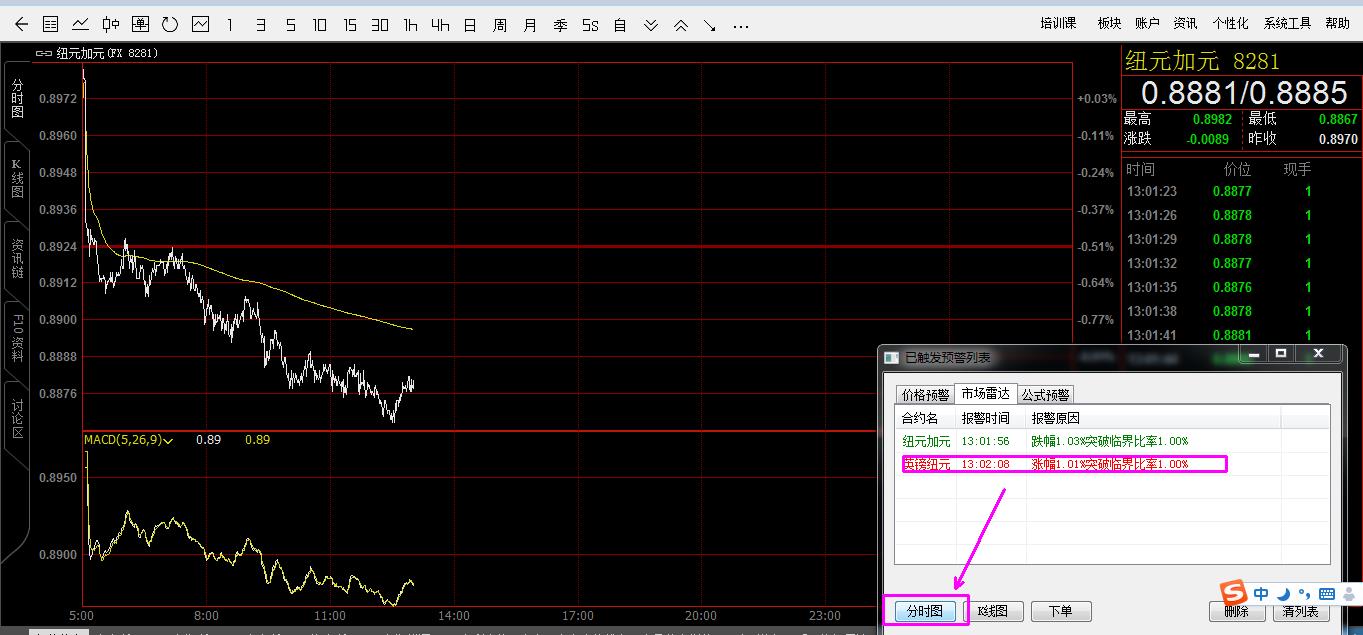5;市场雷达预警品种,鼠标点击不能自动跳转.太不方便,还要手工输入查找.希望改进!! 回答“:点下面的 分时图 k线图 按钮,就跳到对应的合约了 |