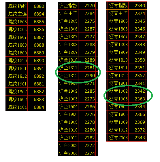 如图,螺纹的代码是比较有规律的,应该是因为它只有十二个月的合约,但金和沥青等这些有超过12个月合约的品种的代码的编写就很不规律,查找起来就比较麻烦。谢谢