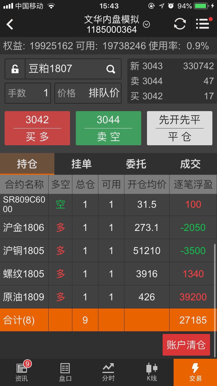 手机快捷清仓 (文华财经随身行Android 5.3.7)投资者咨询:手机快捷清仓 (文华财经随身行Android 5.3.7)来源:文华财经 日期:2018-5-9 15:39 手机快捷清仓怎么操作技术人员回复日期:2018-5-9 15:45 登录交易账号后》在持仓列表的最下方有个合计项 点击这个合计项》就会弹出‘账户清仓’的按钮,点击就可以清仓了 见下图方式体验一下: