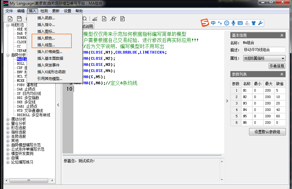 赢8里均线颜色和线组如何修改 (文华财经WH6赢顺V6.7)投资者咨询:赢8里均线颜色和线组如何修改 (文华财经WH6赢顺V6.7)来源:文华财经 日期:2018-5-9 15:06 赢8里均线颜色和线组如何修改技术人员回复日期:2018-5-9 15:14 您这样试试: MA1:MA(CLOSE,N1),COLORBLUE,LINETHICK4; 至于颜色,线型的选择,如图所示: