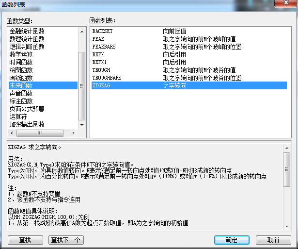 收盘价5%的之字转向*100 (文华财经WH6赢顺V6.7)投资者咨询:收盘价5%的之字转向*100 (文华财经WH6赢顺V6.7)来源:文华财经 日期:2018-5-9 9:59 收盘价5%的之字转向*100怎么表达,谢谢 !技术人员回复日期:2018-5-9 10:04参考: ZIGZAG(C,5,1); 软件右上方》系统工具》指标管理器》新建》插入函数》未来函数中详细了解ZIGZAG的使用