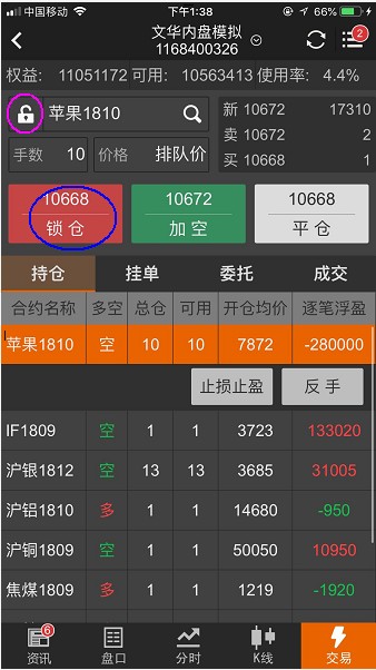 锁仓,是选中持仓合约,点图示中的锁仓按钮,进行锁仓操作,下相反方向的单子