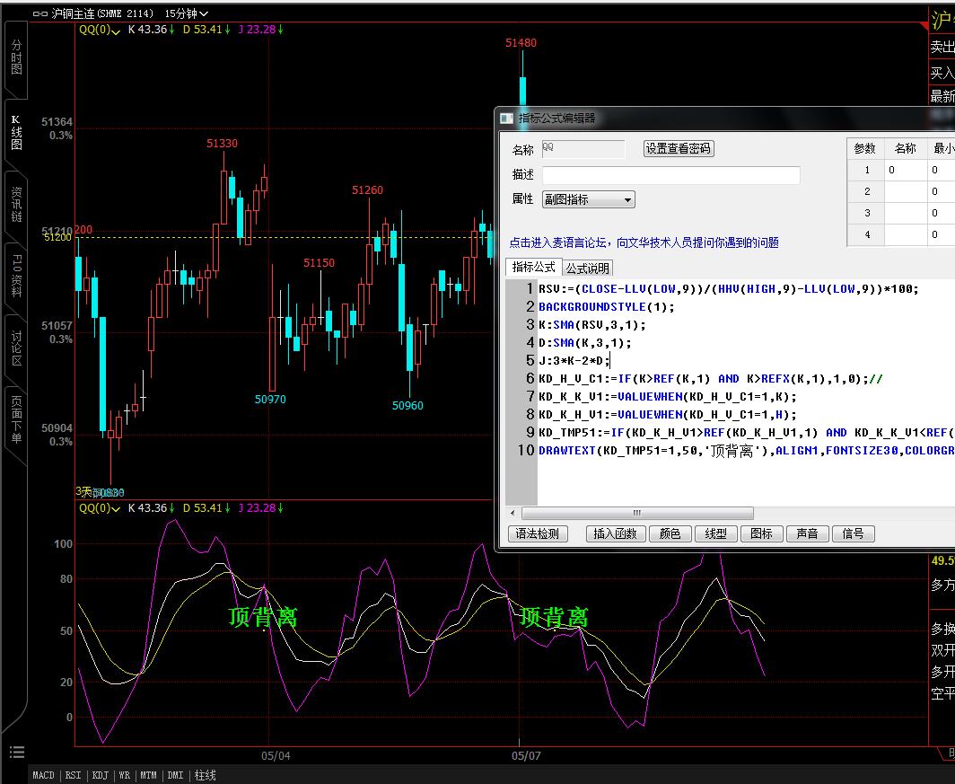 DRAWTEXT(KD_TMP51=1,50,'顶背离'),ALIGN1,FONTSIZE30,COLORGREEN;