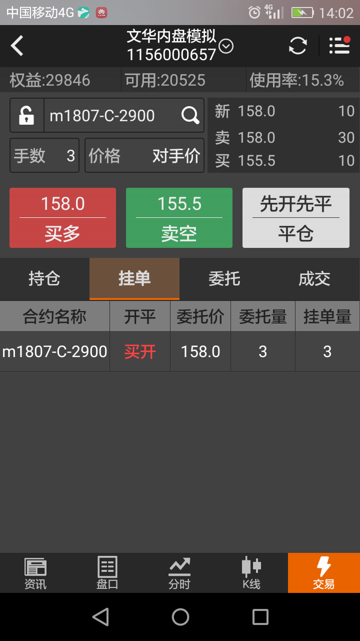 @@模拟买期权合约,总是显示挂单,有截图 (文华财经随身行Android 5.3.7)投资者咨询:@@模拟买期权合约,总是显示挂单,有截图 (文华财经随身行Android 5.3.7)来源:文华财经 日期:2018-5-8 14:07 请问老师,咋回事 文件名:Screenshot_2018-05-08-14-02-57.png 技术人员回复日期:2018-5-8 14:17 我们查了一下,您上面的挂单是正常的。因为这个合约非常的不活跃 虽然委托价格等于了卖价,但是盘中也必须有最新价产生才能撮合一笔,也就是盘中要有交易才能撮合