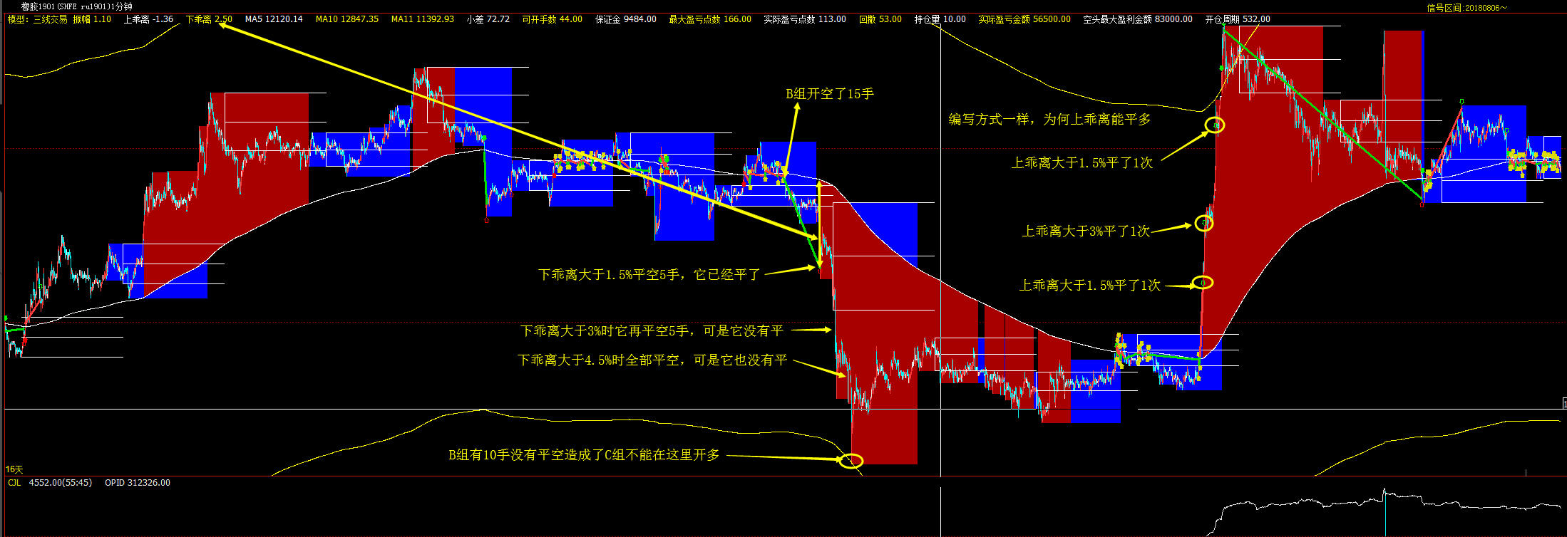 B组8月15日10点10分给RU1901开了15手空单,晚上9点14分平了5手空单,后面满足平空条件时它没有把10手空单平掉,与你说的竞价不是在同一个时间点呀,没有把空单平掉就影响了A组的开多。前面平了5手空单应该有5手的资金可以给A组开多的呀。