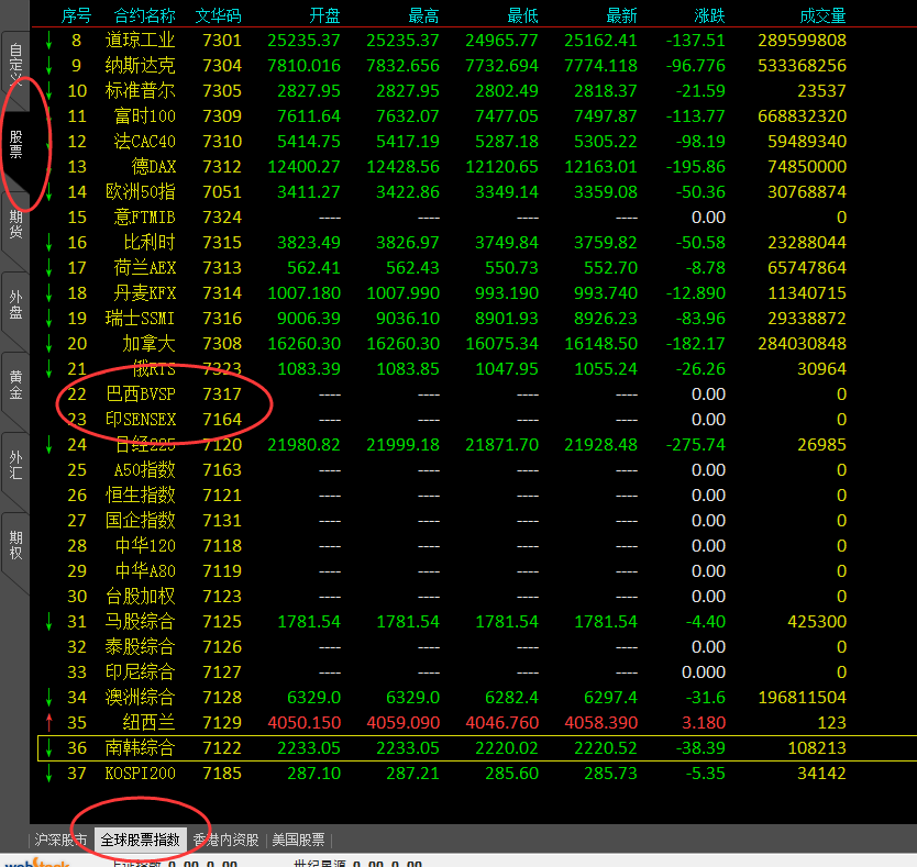WH6上有没有,巴西股指、印度股指、南非股指的K线图? (文华财经WH6赢顺V6.7)投资者咨询:WH6上有没有,巴西股指、印度股指、南非股指的K线图? (文华财经WH6赢顺V6.7)来源:文华财经 日期:2018-8-16 9:08 WH6上有没有,巴西股指、印度股指、南非股指的K线图?技术人员回复日期:2018-8-16 9:21 巴西BVSP 、印度SENSEX如图所示,南非股指需求较少,目前没有提供,我们后续搜集一下需求考虑一下投资者咨询:WH6上有没有,巴西股指、印度股指、南非股指的K线图? (文华财经WH6赢顺V6.7)来源:文华财经 日期:2018-8-16 9:08 好的,谢谢;我记得以前WH6有这些数据