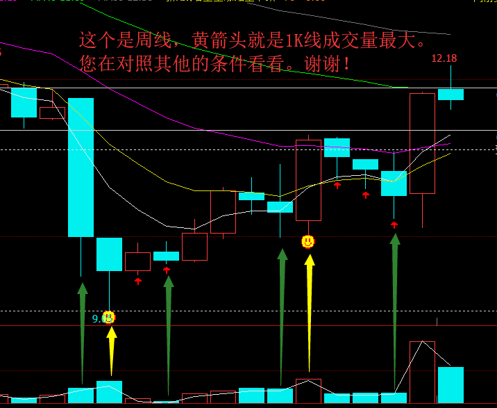 5、 符合上述条件,在K线下方标注红色向上箭头图标。