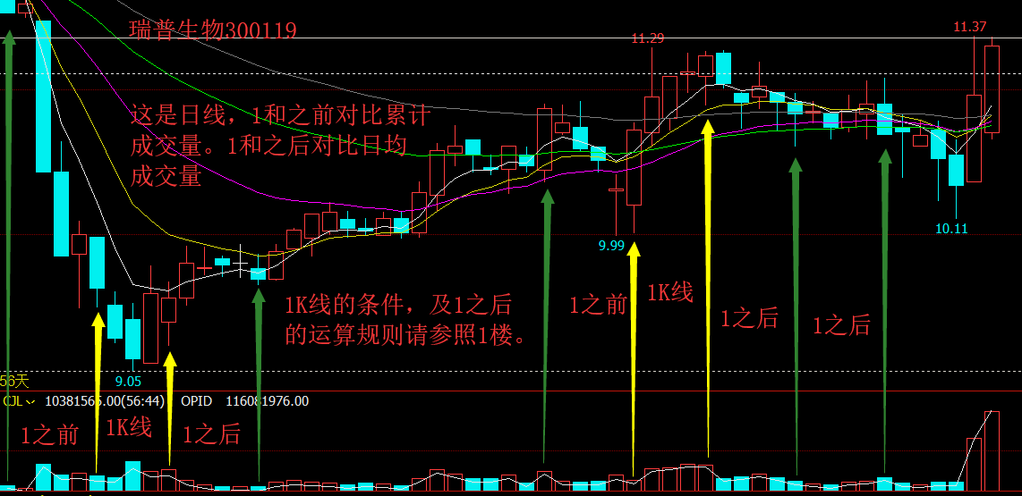 A4:=MA(V,DAYBARPOS)>REF(MA(V,DAYBARPOS),DAYBARPOS);