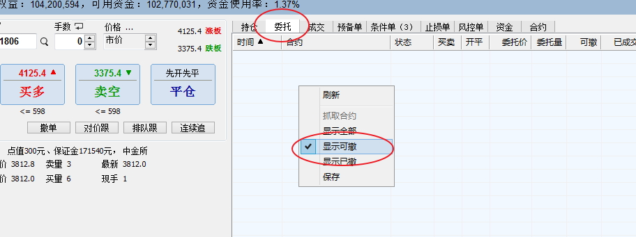 如果是需要下单版界面操作,在委托栏里,也可以选择“可撤” 就能显示全部的挂单合约了