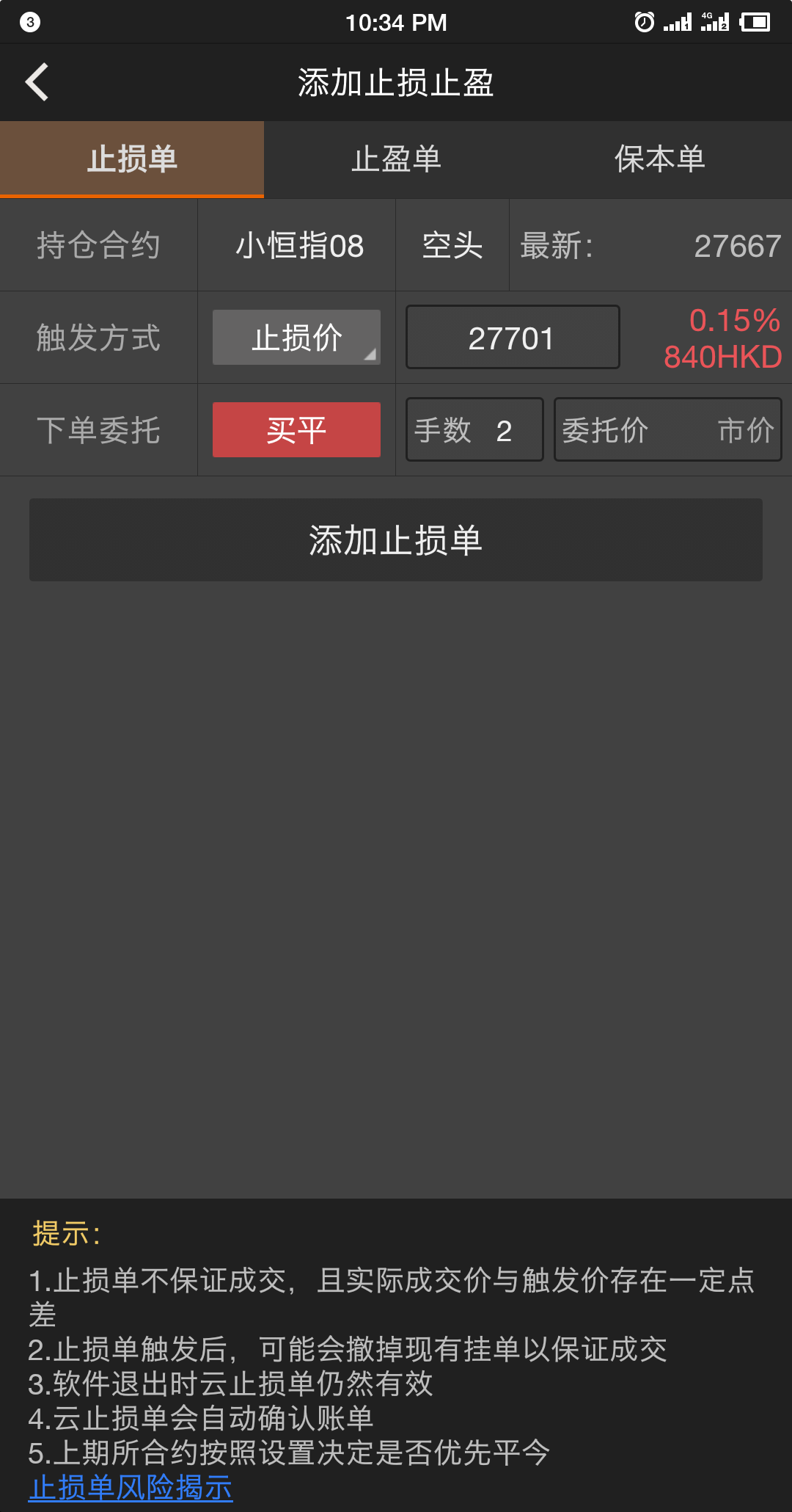 投资者咨询:恒生指数止损只能设置为对手价模式 (文华财经随身行Android 5.4.5(238))