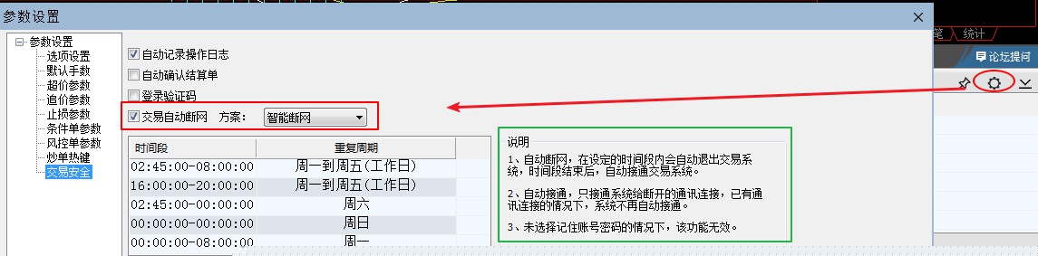 关于WH7的报警 (文华财经wh7睿期)投资者咨询:关于WH7的报警 (文华财经wh7睿期)来源:文华财经 日期:2018-5-7 8:07 老师好,WH7的画趋势线预警,只能当日有效,是吗?技术人员回复日期:2018-5-7 8:24 不是的趋势线预警只针对当次启用软件生效,跟交易日更换没有关系比如8:00启动软件,设置了趋势线预警,16:00关闭了软件。预警线只在8:00-16:00有效,关闭或者之后再启动软件,都是无效的 不过趋势线还在,您再手动右键设置趋势线预警使用就可以了 或者您可以本地一直不关闭软件,24小时连续运行,趋势线预警就是一直有效的了 投资者咨询:关于WH7的报警 (文华财经wh7睿期)来源:文华财经 日期:2018-5-7 8:07交易自动断网功能,是什么意思呢?技术人员回复日期:2018-5-7 9:14 交易自动断网是辅助软件24小时运行的一个功能,可以自动断开、连接交易账号 不过您应该是习惯了手动登录和退出交易,您在后续使用中可以继续使用这个方法,是可以实现1楼需求的 感兴趣的话,也可以研究下交易自动断网功能