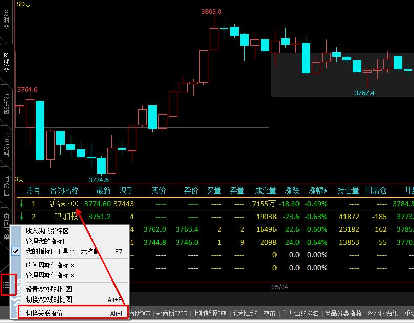 查询相应期货品种相关的A股股票的功能 (文华财经WH6赢顺V6.7)投资者咨询:查询相应期货品种相关的A股股票的功能 (文华财经WH6赢顺V6.7)来源:文华财经 日期:2018-5-6 11:36 群主,你好。 记得先前文华有查询相应期货品种相关的A股股票的功能,怎么现在好像没有该功能了。麻烦群主,帮忙解答下,谢谢。技术人员回复日期:2018-5-6 16:37 您是说关联报价? 进入系统K线图,点击左侧图标》关联报价即可您刚接触软件。常用的操作多在软件右上角》帮助》软件说明书了解下