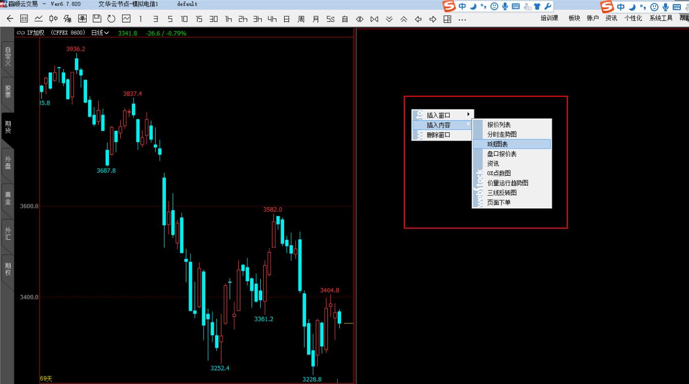 [求助]怎样分割页面 (文华财经WH6赢顺V6.7)投资者咨询:[求助]怎样分割页面 (文华财经WH6赢顺V6.7)来源:文华财经 日期:2018-8-14 11:34 怎样分割页面成多个窗口,只显示K线不看其他指标,怎样保存这个页面,谢谢了 技术人员回复日期:2018-8-14 13:09 首先在软件右上角》个性化》新建页面 然后右键》插入窗口,再针对插入的窗口》右键插入内容就可以 不需要加载指标,主图右键》叠加技术指标删掉K线以外的其他指标就可以 设置好页面以后,使用ctrl+s保存自设页面就可以,您操作体验一下投资者咨询:[求助]怎样分割页面 (文华财经WH6赢顺V6.7)来源:文华财经 日期:2018-8-14 11:34 谢谢啦