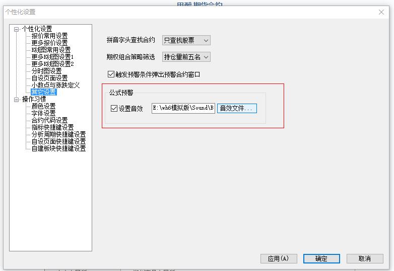 SPARK函数发声问题 (文华财经WH6赢顺V6.7)投资者咨询:SPARK函数发声问题 (文华财经WH6赢顺V6.7)来源:文华财经 日期:2018-5-5 0:15 老师你好,SPARK函数能发其它的声音吗?因为开了两个WH6看盘的软件,不想把声音弄成一样的 技术人员回复日期:2018-5-5 8:21 可以的,菜单 个性化》个性化设置》其他设置修改一下公示预警音效文件即可