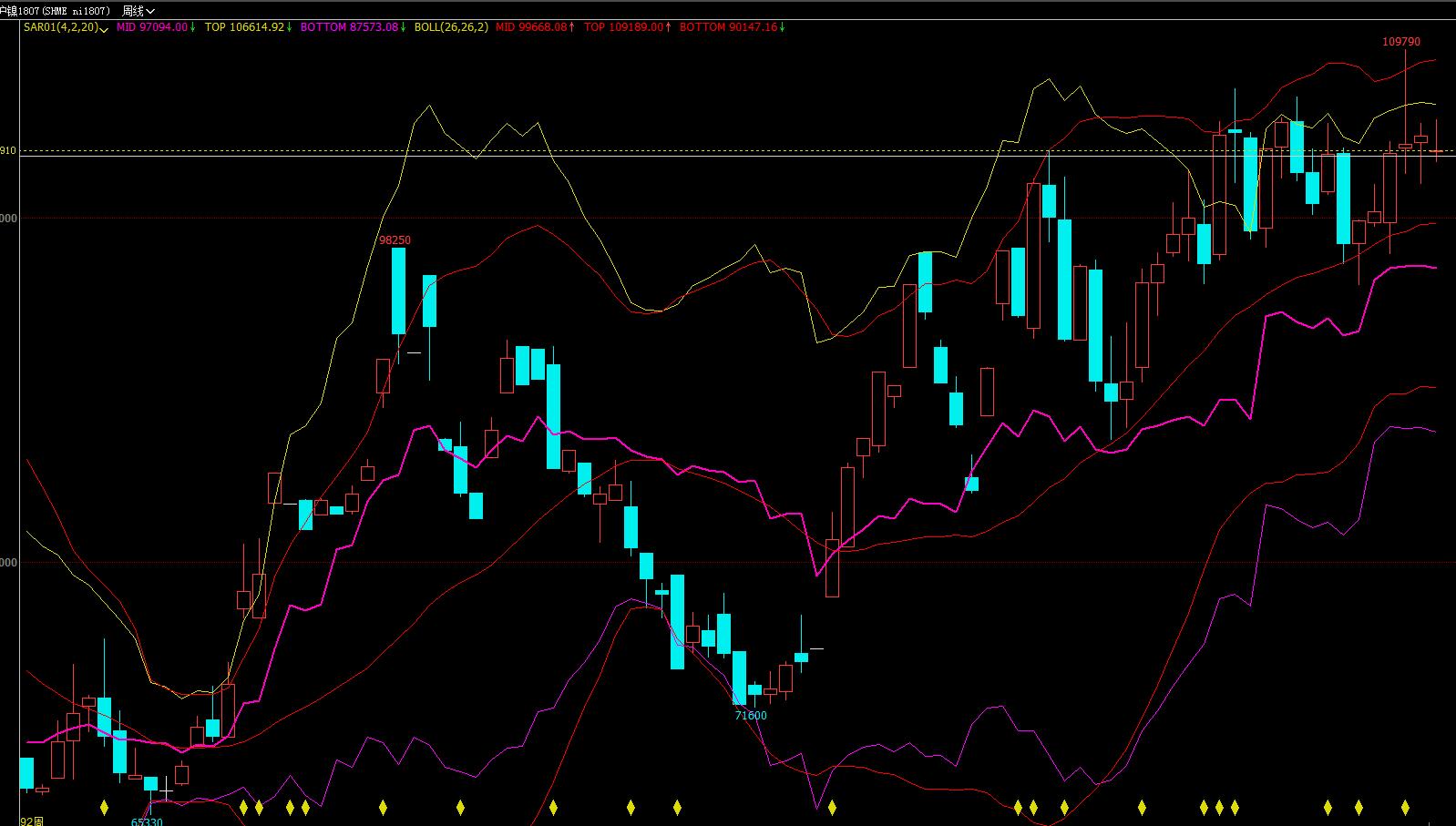 SUM(WW,SUMBARS(WEEKDAY<REF(WEEKDAY,1),4))+C)/5,COLORMAGENTA,LINETHICK2;》