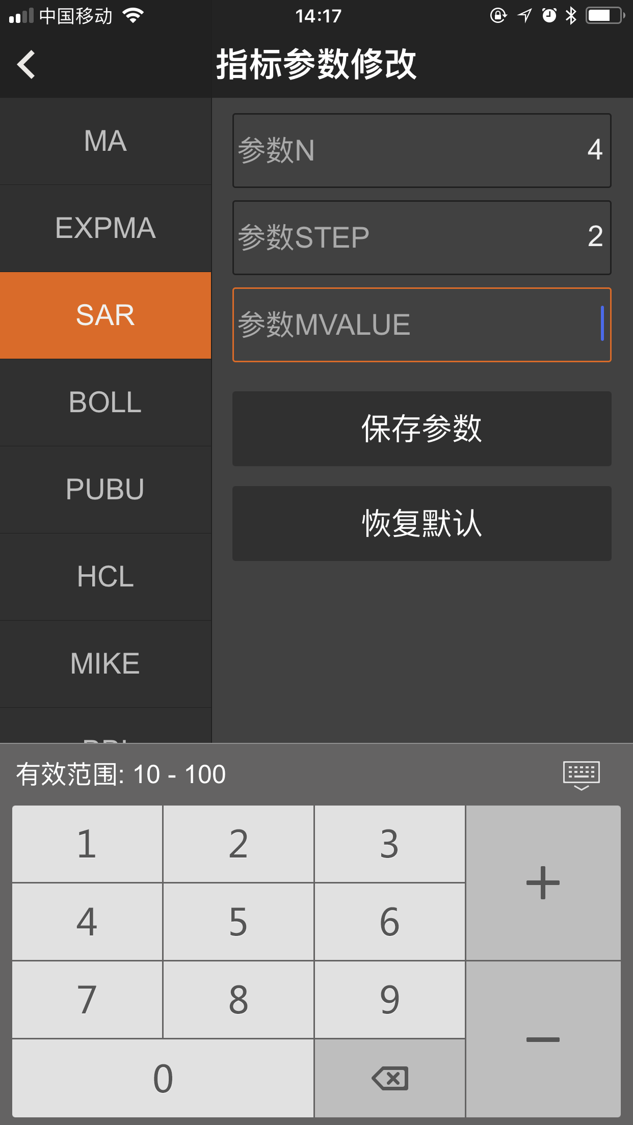 请教老师,手机版参数设置跟电脑版参数设置问题 (文华财经随身行iPhone 5.3.8)投资者咨询:请教老师,手机版参数设置跟电脑版参数设置问题 (文华财经随身行iPhone 5.3.8)来源:文华财经 日期:2018-5-4 14:24 老师,为什么SAR参数,手机版跟电脑版,会有那么大差别?比如如图所示,第三栏,为什么是10-100???而电脑版就是1-50呢???你们可以后台把手机版参数,弄成电脑版吗??? 文件名:F13FAD28-BB98-450E-9CBA-E4144EC71DD7.png技术人员回复日期:2018-5-4 14:33 参数默认范围,后续版本会优化为1~100,您可以关注下后续升级 另外,PC版本的参数范围是可以自己调整的,所以完全和PC一致,意义不是很大PC版1~50是满足您需求的话,那优化为1~100,也完全够用的 您了解下