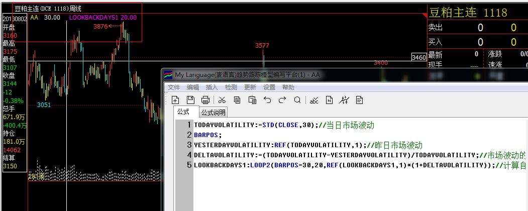 DELTAVOLATILITY:=(TODAYVOLATILITY-YESTERDAYVOLATILITY)/TODAYVOLATILITY;//市场波动的变动率