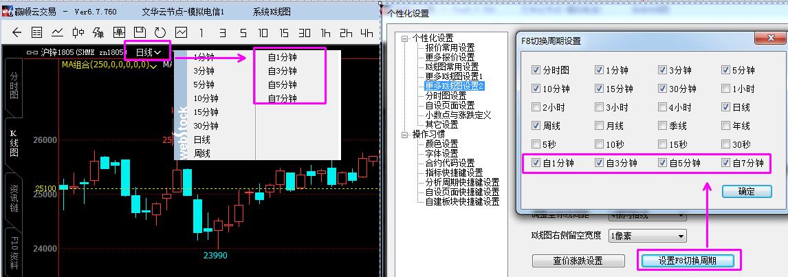 F8已经设置成自己常用的6个周期,但单个F8如果转换周期过头了,要转一圈才能回来,用F8加ctrl+F8两个键来前进后退但距离太远,不方便操作,希望能把这个意见提到软件开发工程师那边,加两个中括号来左右切换,现在常用的期货和股票软件都是有这个功能的。